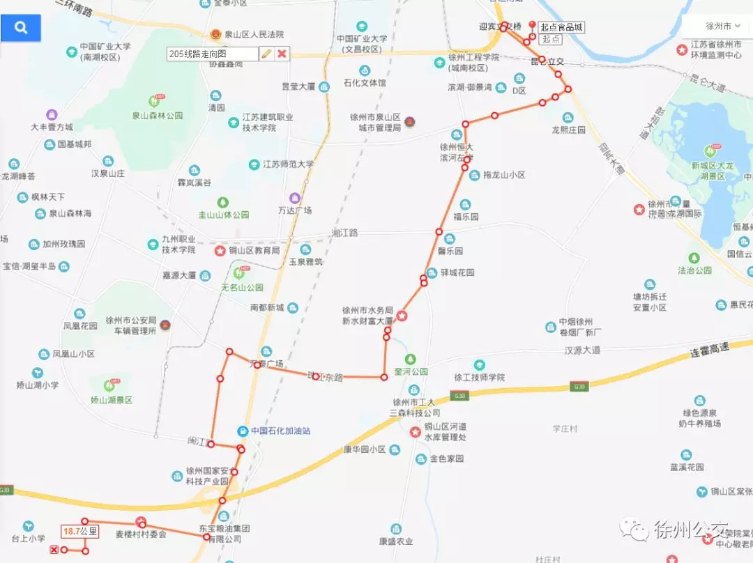 為滿足廣大市民出行需求,進一步擴大徐州高新區(qū)和市區(qū)的交通線網(wǎng),促進區(qū)域交通和諧發(fā)展,為更多的市民提供便捷的城市客運服務(wù),徐州公交開通了205路線,并于12月18日上午8:30分開始試運行。具體線路走向及??空军c如下: