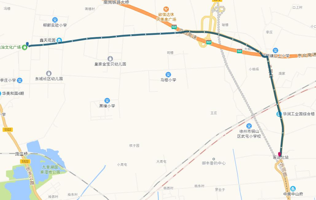 線路站點:建筑學院、江蘇師范大學、師范大學地鐵站、萬科新都會、港鑫城、南洋國際、康樂園南門、無名山公園地鐵站、銅山區(qū)政府、楚河金茂府、嵩山路、銅山新區(qū)總站、久隆鳳凰城北門、保利迎賓館、龍腰山公園、泉山森林海、第一人民醫(yī)院南門。