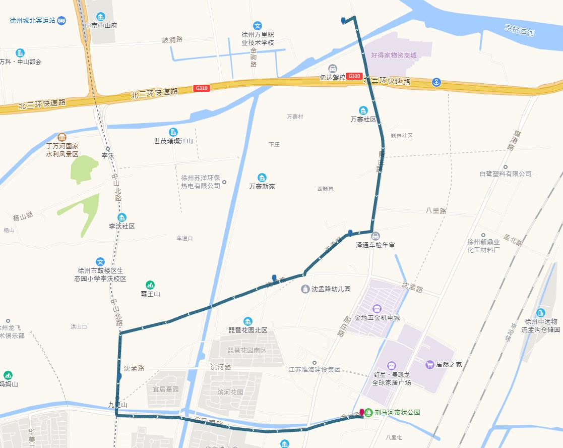 線路站點:山南小鎮(zhèn),山水龍瑞,馬場湖路口,馬場湖,怡康花園,后勤學院北,誠坤鋼材市場,蘇堤北路立交橋(西),蘇堤北路立交橋(東),蘇堤路小學,永業(yè)花園小區(qū),江蘇四監(jiān),銅沛路東口,中山北路立交橋