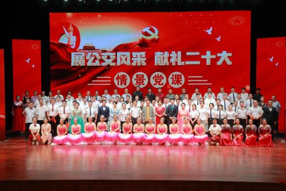 為激勵廣大黨員群眾以實際行動迎接黨的二十大勝利召開,8月10日下午,徐州公交集團成功舉辦“展公交風(fēng)采 獻(xiàn)禮二十大”情景黨課。市交控集團黨委委員、紀(jì)委書記胡濤,市交通運輸局宣傳教育處處長高夫健,徐州廣播電視傳媒集團總編室主任劉建玲,市公交集團外部董事,市交控集團黨建工作部、群眾工作部部門領(lǐng)導(dǎo),以及公交集團黨委班子成員、先進(jìn)勞模、職工代表共450余人出席并觀看演出。