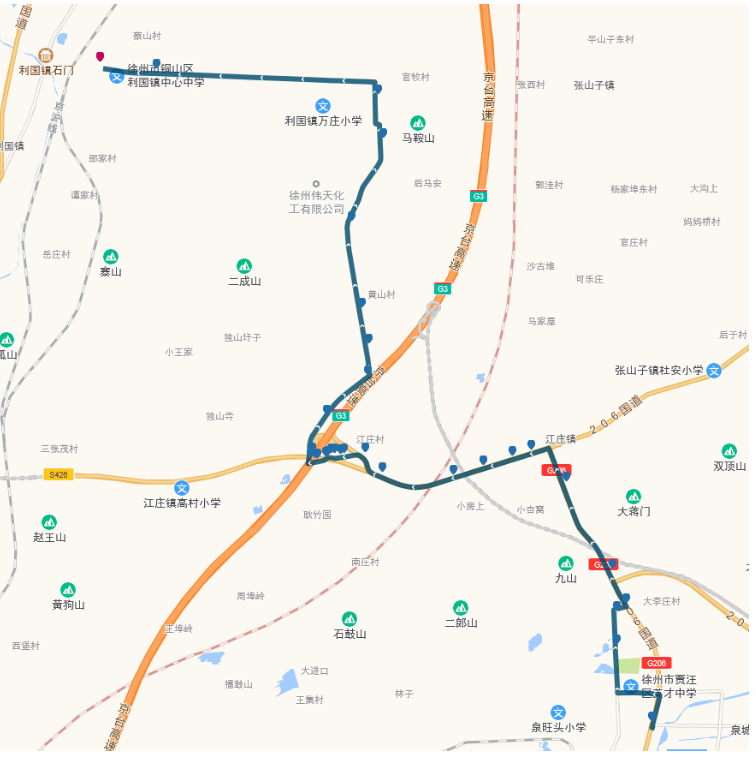 ??空军c(diǎn):賈汪客運(yùn)站,宏安路口,賈汪老站,大李莊,江莊南,江莊北,鐃鈸,龍山水泥廠,萬莊,馬元,郝家,蔡山,利國(guó)。
